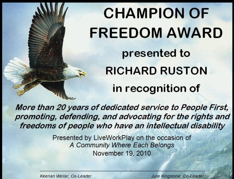 Richard: a loyal friend and advocate. He suffered and had the courage to speak out of his own lived experiences. Richard grew up in the People First Movement. He never stopped acknowledging Pat Worth and Peter Park who founded People First. He had so much humility. He had a lot to overcome in his own life and family and yet he was very determined. Once he set his mind on something he was unstoppable. His courage was amazing. He was unfaltering in his commitment to bringing attention to those who use complex ways of communicating what they are feeling and thinking. He was not afraid of taking on systems and knew what it took to build safeguards so that People First could not be coerced into inaction. He was a leader in the People First movement. That was not easy. There were lots of dynamics that make standing up tall and being heard difficult. He was a man who did the best he could. He had a deep compassion for others. He was passionate about people having their rights acknowledged and honoured. He always tilted his head when he needed to share a painful story or tell a difficult truth that others did not want to hear., clear sorrowful eyes so profound that no-one could doubt his words and their meaning.