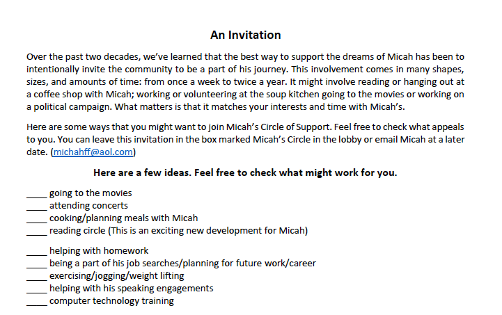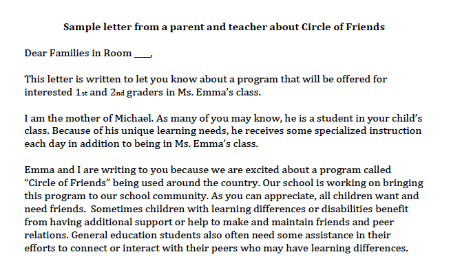 Sample letter from a Parent and Teacher about Circle of Friends