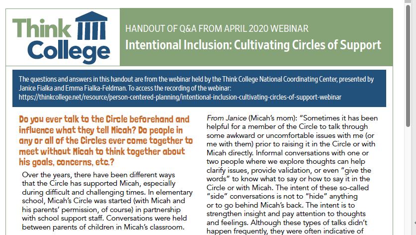PDF of Q and A from April 2020 Think College Webinar offered by Janica Fialka and Emma Fialka-Feldman