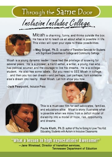 A 25 minute film about a young adult with cognitive disabilities going to college. Micah Fialka Feldman wanted fully inclusive education. This is the story of how Micah, his family and friends succeeded in living that dream – in high school and in college. They all wanted it – they worked – and they got it! Micah is also featured in another more recent video: Intelligent Lives (available commercially).